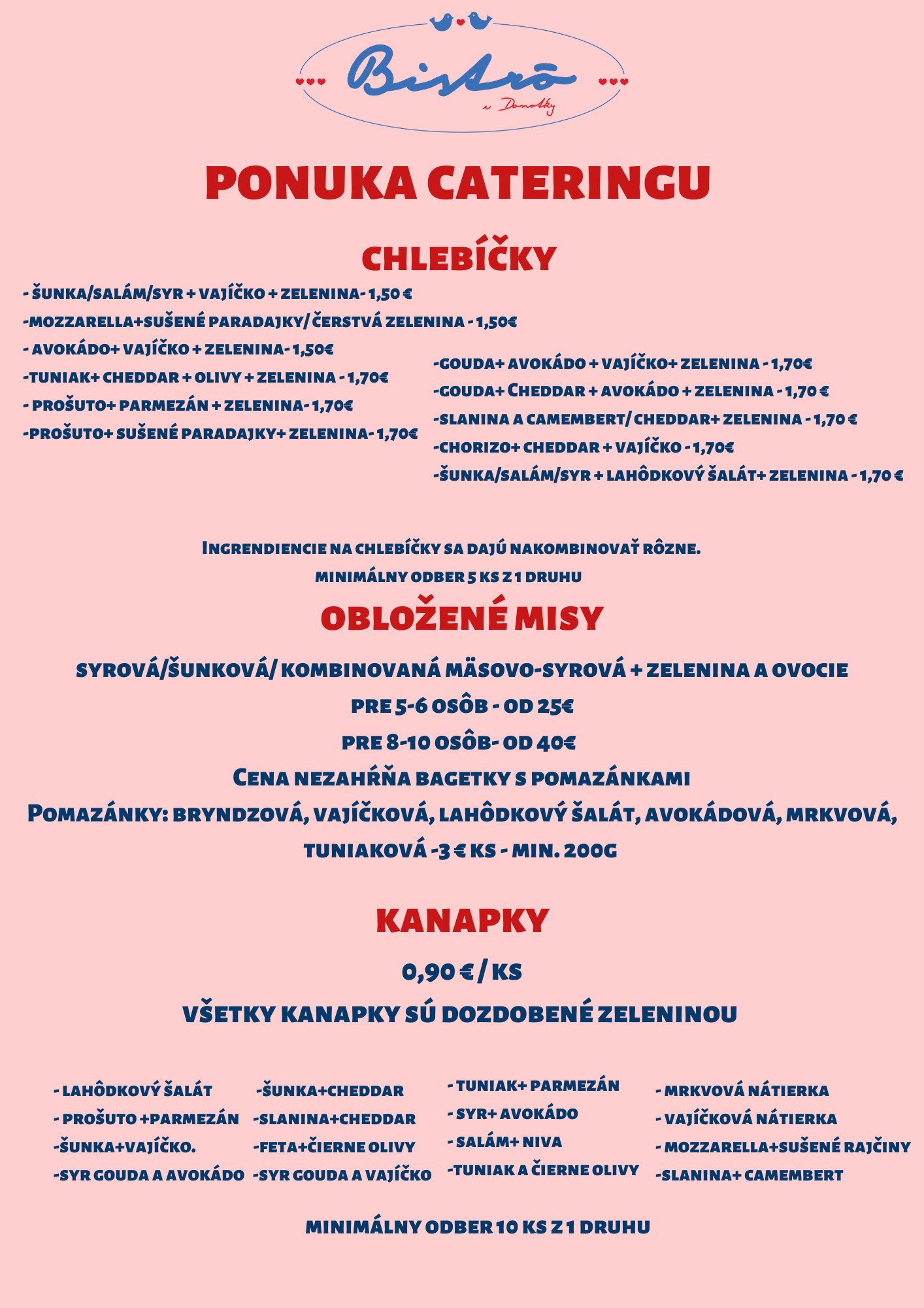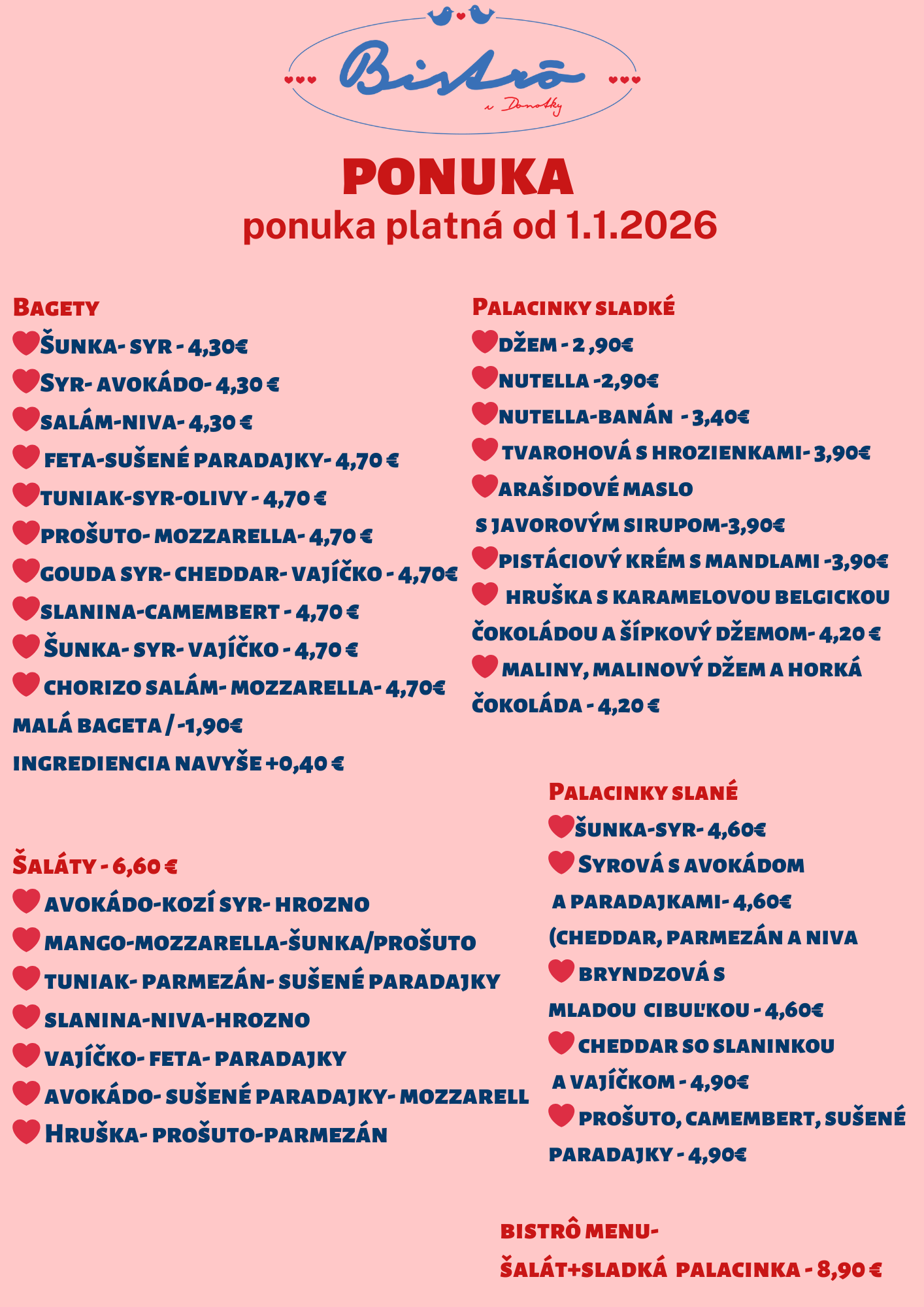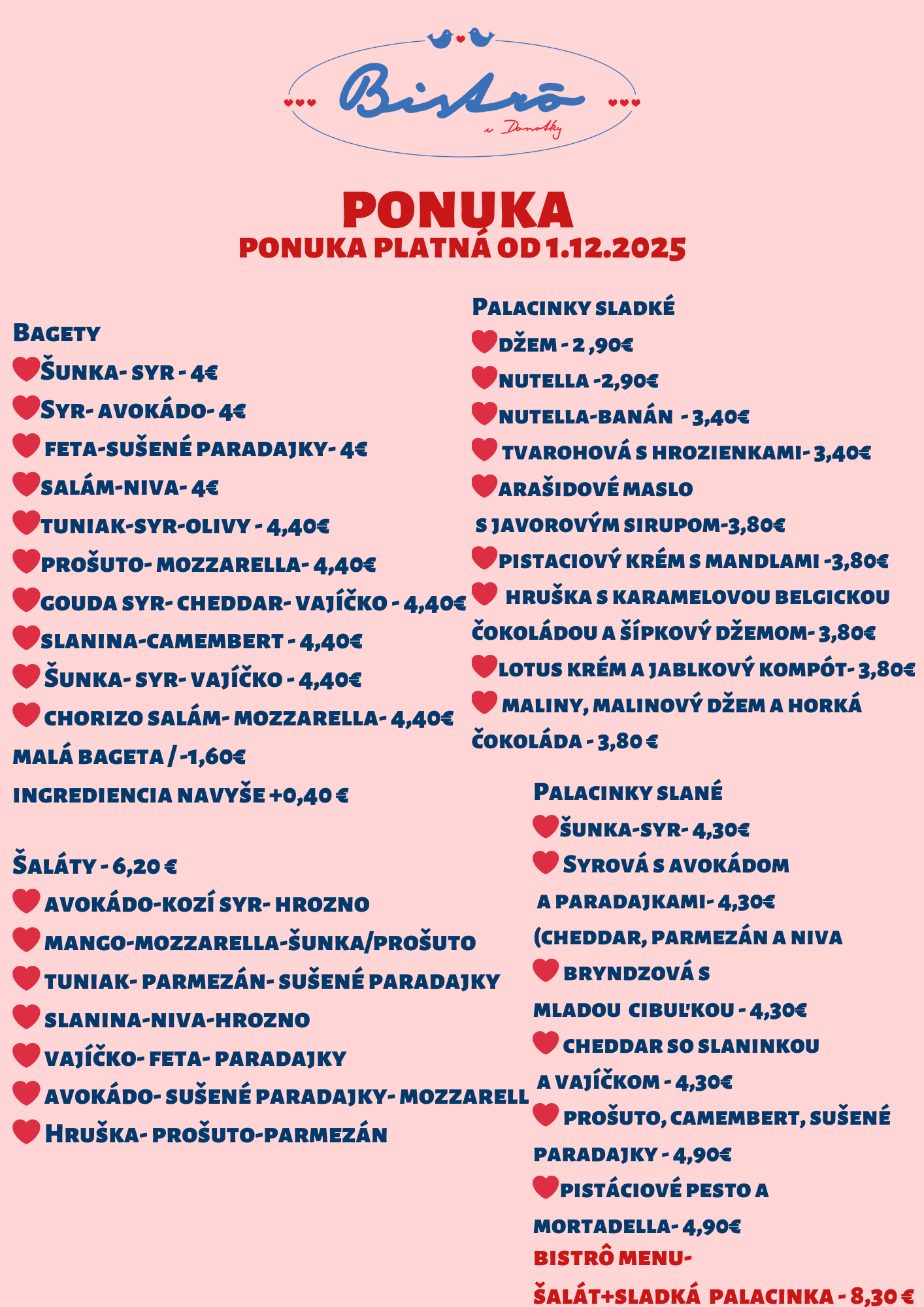 V roku 2018 vzniklo v centre Bernolákova malé, milé bistro. Na začiatku bola vidina palacinkárne, ktorá sa postupne prerástla do bistra aj so širšou ponukou. U nás nájdete potešenie už od skorého rána, kedy si môžete vychutnať kávičku a raňajky a zároveň až do večera Vám pripravíme francúzske palacinky na sladko i slano, zapekané bagety a zaujímavé šaláty. Pri Vašej oslave, stretnutí s priateľmi a kolegami prípadne inej špeciálnej príležitosti Vám vieme pripraviť chutný catering. Okrem iného nás môžete stretnúť s našim pojazdným vozíkom, kde Vám pripravujeme chutné, čerstvé palacinky na festivaloch, dňoch obce, detských a firemných podujatiach nielen v Bratislavskom kraji, ale takmer po celom Slovensku. Našou snahou je dbať na kvalitu, čerstvé suroviny a zároveň i netradičné chute. Tešíme sa na Vašu návštevu a ďakujeme za podporu.